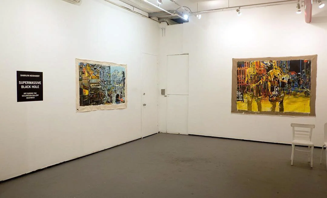Many of the paintings in this series were created on unframed, unstretched canvas. For their premiere exhibition, Ms Neidhardt and Mr Stout decided to exhibit them without frames or stretchers. The energy of the paintings vibrates out from the unrestricted center. Wild brushstrokes reach past the point where a clean edge might hem the image in. A raw canvas edge evokes the white edge of a printed photograph, while the palpable fold and texture of the material recalls political banners and more immediate forms of communication.