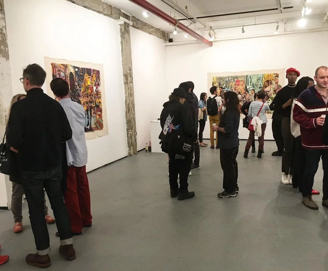 The artist at the opening reception, Sept 7 2018, Art During the Occupation Gallery in Bushwick (Brooklyn). Art work in background is ‘I’ll Never Let You Sweep Me Off My Feet’. Dress by Carri Skoczek. Photo by Eva Mueller.
